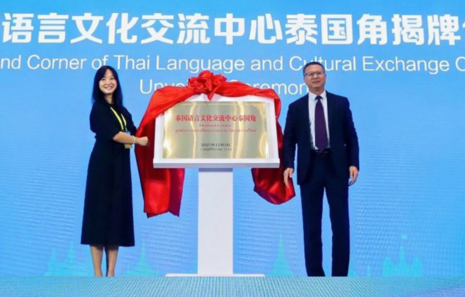 在2025黄河—湄公河交流周暨东盟中小企业合作发展山东行活动中,德州学院党委书记吴君参加会见,并在开幕式上与金清清共同为“德州学院泰国语言文化交流中心泰国角”揭牌,这标志着中泰教育文化合作迈入新的发展阶段,成为双方深化交流、增进友谊的又一重要契机。
